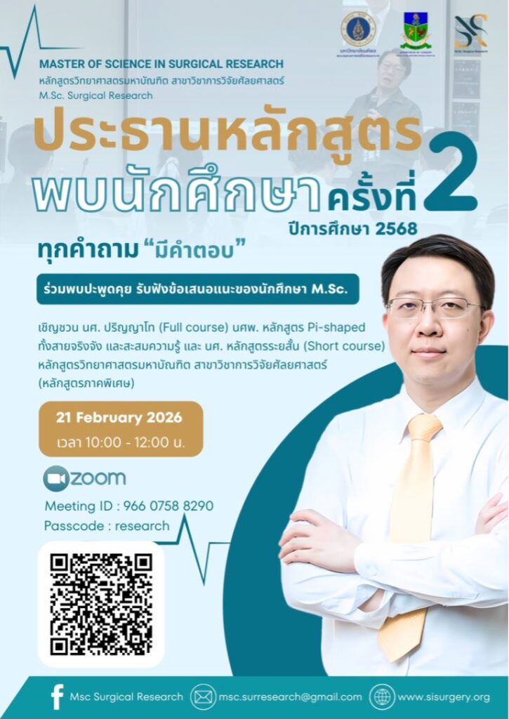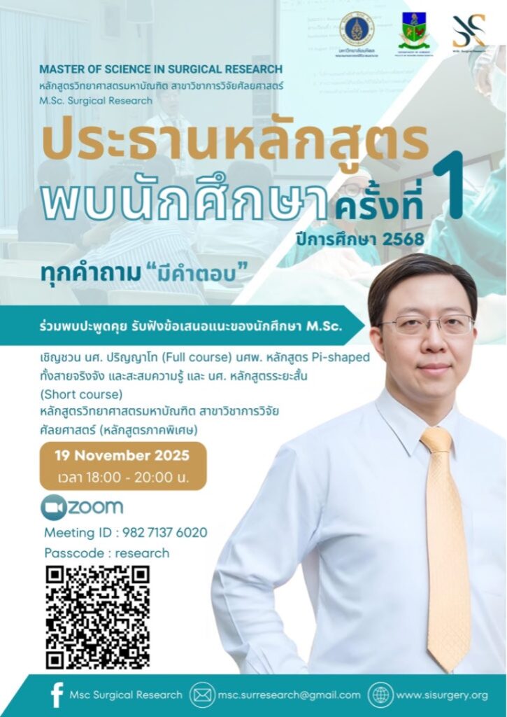 ประธานพบนักศึกษาของหลักสูตรวิทยาศาสตรมหาบัณฑิต สาขาวิชาการวิจัยศัลยศาสตร์ ประจำปีการศึกษา 2568
