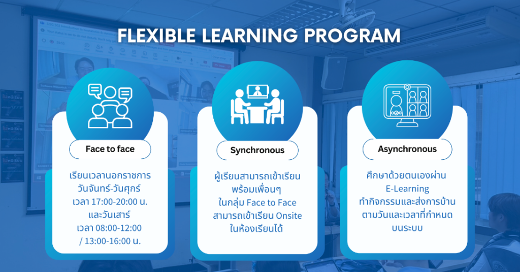 โดยหลักสูตรมีรูปแบบการเรียนที่หลากหลาย นักศึกษาสามารถเลือกลงเรียนได้ทั้งรูปแบบ Onsite และ Online มีความสะดวกและยืดหยุ่นอย่างมาก